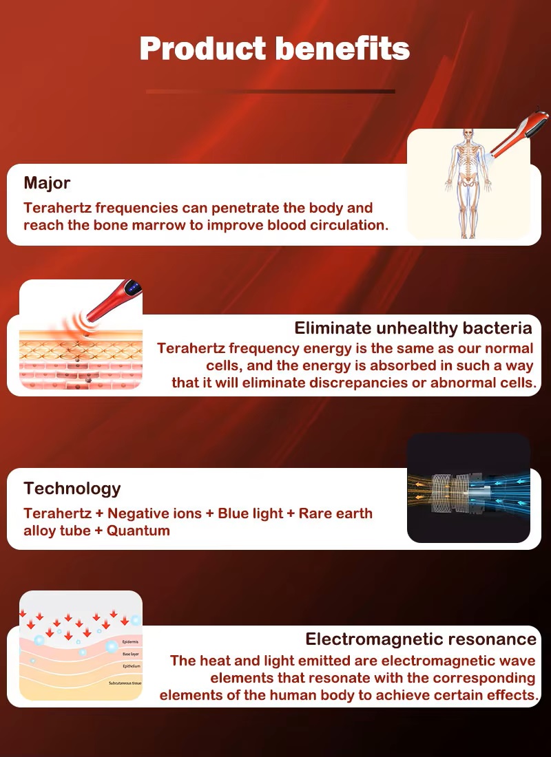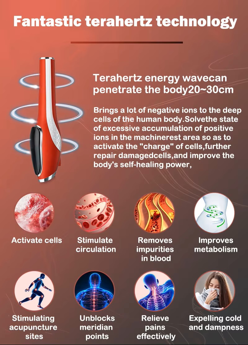 Terahertz wave can activate nerves and cells to increase human metabolism, provide fresh nutrition to cells, improve the absorption of energy by cell mucosa, adjust the balance of human cells, activate and improve a variety of enzymes, and enhance material metabolism and energy metabolism. Light waves instantly produce high temperature at the stasis in the body, quickly kill mutant cells, open meridians, activate dormant cells, strengthen, enhance, repair and soften damaged cells. Inhibiting cell mutation and treating all diseases caused by cytopathy have remarkable curative effect.