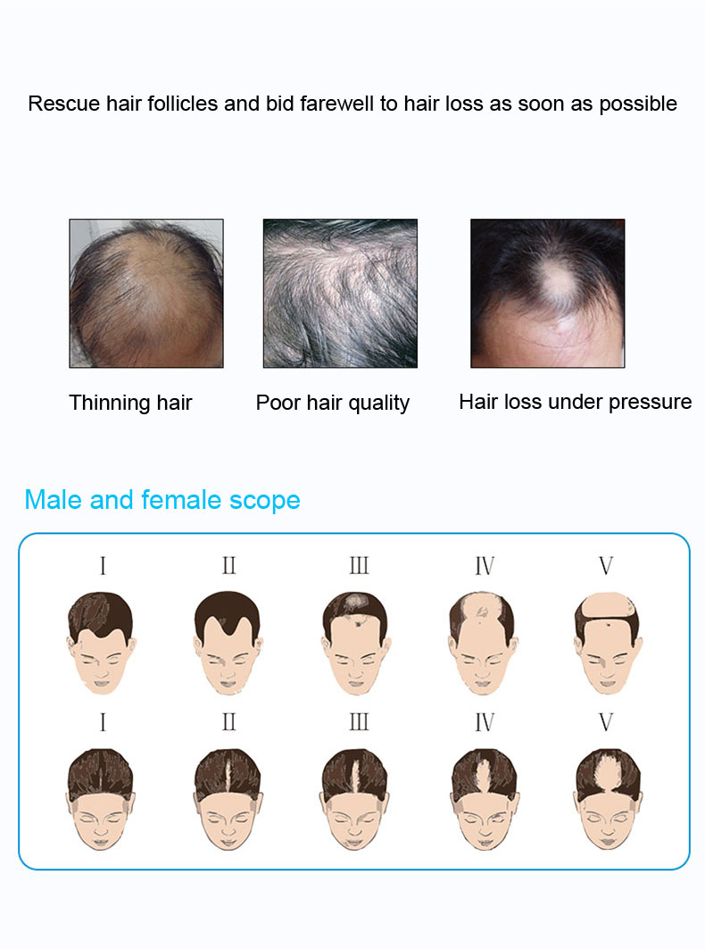 Hair loss treatment, hair care, hair loss cure, male pattern baldness, hair loss in women. baldness cure, alopecia treatment. Our laser hair growth machine is the best product for home use, as it's portable design and easy to operate. It has been clinically proven effective for hair loss treatment, stop hair fall. Help hair regrowth and alopecia treatment for both men and women. Our hair growth laser machine is a kind of low level laser therapy device. It works by 678nm laser to stimulate the hair follicles, restore the atrophy hair follicle, regrow hair, bring back your healthy and thick hair.